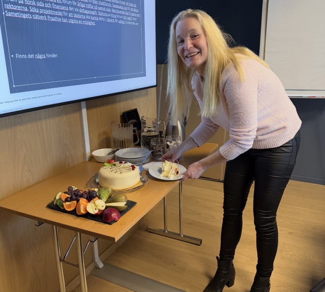 Jane Magnusson ledet implementeringsworkshoppen i Trondheim. Tilfeldigvis hadde hun også bursdag, noe prosjektet feiret med kake. Foto: Mai Løvaas/Oi! Trøndersk Mat og Drikke