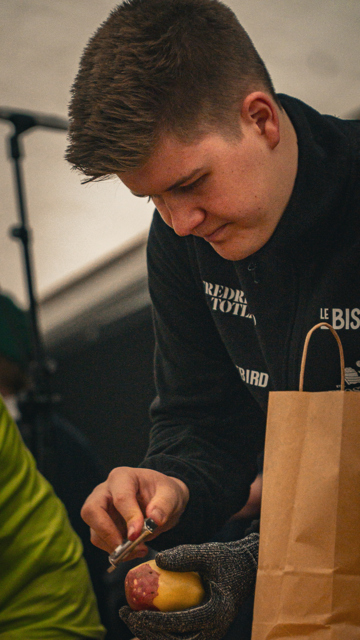 – Vi endte opp med å kjøre for at det ikke skulle bli altfor dyrt. Han ene skulle kjøre helt fra Bodø, plukke oss opp i her i Trondheim, så kjøre videre til Løten. Vi kjørte hele natten og kom frem i syv-tiden på morgenen, så det ble mye kjøring, men vi koste oss, forklarer Fredrik. Fredrik venter på startsignalet under NM i potetskrelling. Foto: Jacob Gåsbakk.