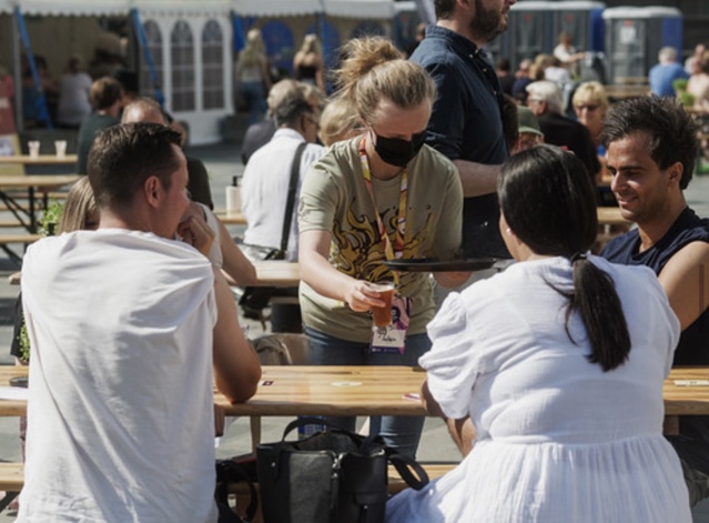 Trass pandemi ble det Bryggerifestival i 2021. Brygg og mat ble servert til bordene, og alle som jobbet festivalen måtte ha munnbind. Foto: Ole Ekker