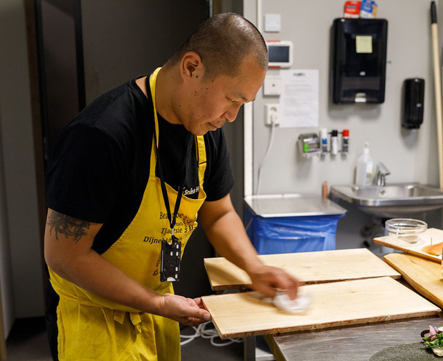 Så var det militæret, hvor han havnet i marinen og som kokk på ubåt. Som kokk på utbåt må man kunne alle prosedyrer og det var lang sikkerhetsklarering og testing av hvordan rekruttene reagerte på stress. På KNM Uthaug dro de under havets overflate rundt i Norskehavet, Barentshavet, Ofothavet og Lopphavet. På ubåtkjøkkenet, som lå rett under torpedorommet, var det under en kvadratmeter golvflate, og når han åpnet ovnsdøra måtte han ta et skritt til siden. - Jeg røyker jo, selvfølgelig. Jeg måtte lære meg prosedyren når vi var oppdykket, det var eneste gangen jeg fikk røyke. Da sto jeg oppe i tårnet med luka åpen og røyket. Tre ganger i døgnet vi var oppdykket, da var jeg nødt til å utnytte tiden, sier han og smiler. Hva lærte du om kokkeyrket av å jobbe på ubåt? - Jeg ble flink til å utnytte det å ikke har stor plass, og det å forberede mye på forhånd. På kjøkkenet på offisersmessa på Håkonsvern stekte, kokte og vakuumerte vi mye. Når vi var neddykket fikk vi for eksempel ikke lov til å steike for det går utover luftkvaliteten, sier han. På dette tidspunktet i karrieren din, tok du med deg noe av det sørsamiske inn på kjøkkenet? - Nei. Når folk ansatte meg fortalte jeg ikke om det sørsamiske opphavet mitt, det var kun hvis de spurte. Jeg lagde sjelden samisk mat på den tiden, sier han.