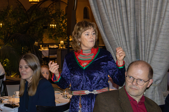 Eva Nordfjell forteller om samisk mat og kultur under middagen.