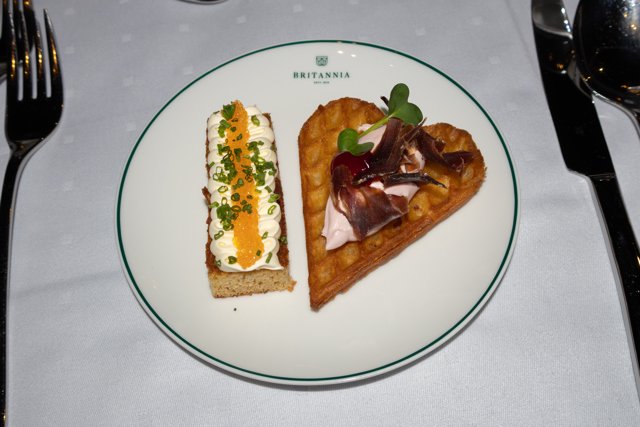 Snacksen som startet showet: Brioche med rørosrømme og sikrogn fra Aursund. Vaffel med tørket reinsdyrkjøtt og tyttebærkrem.