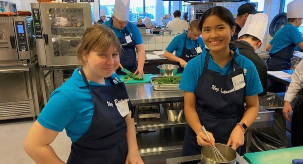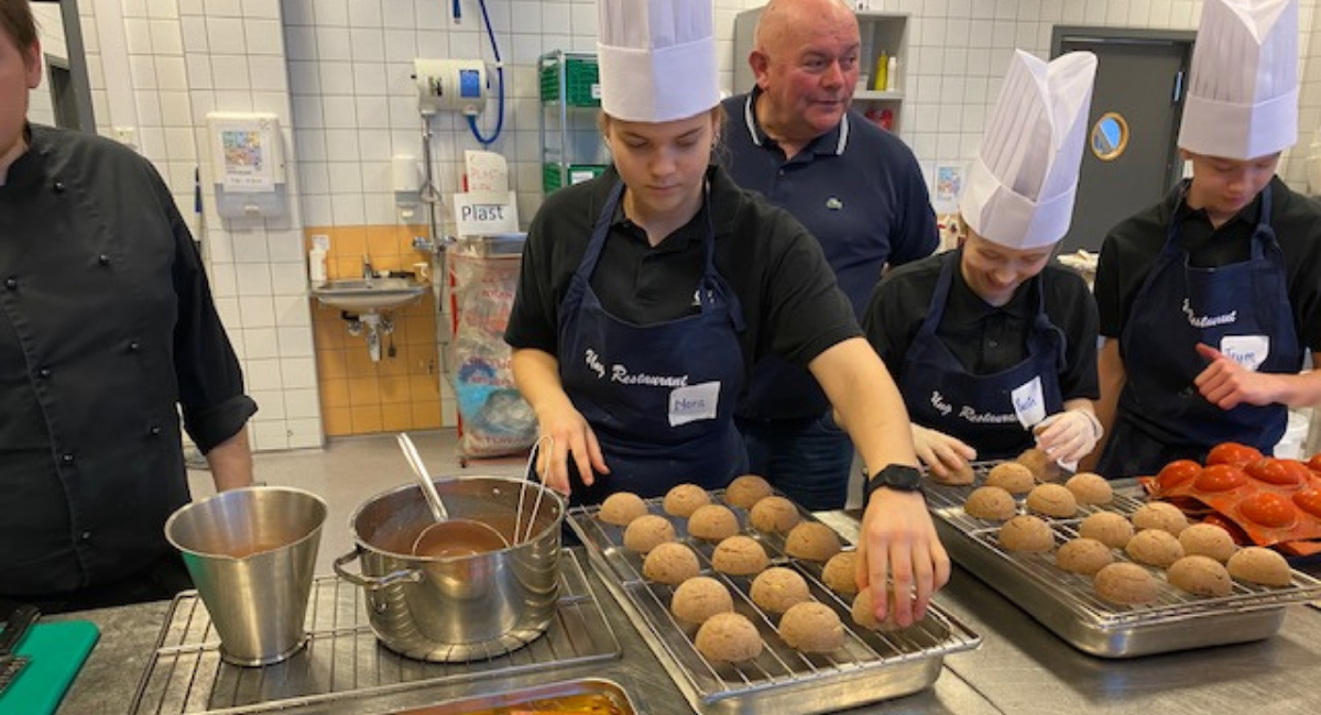 Elever fra Vanvikan skole i full sving på kjøkkenet på Kuringen Bryggehotell på Fosen.