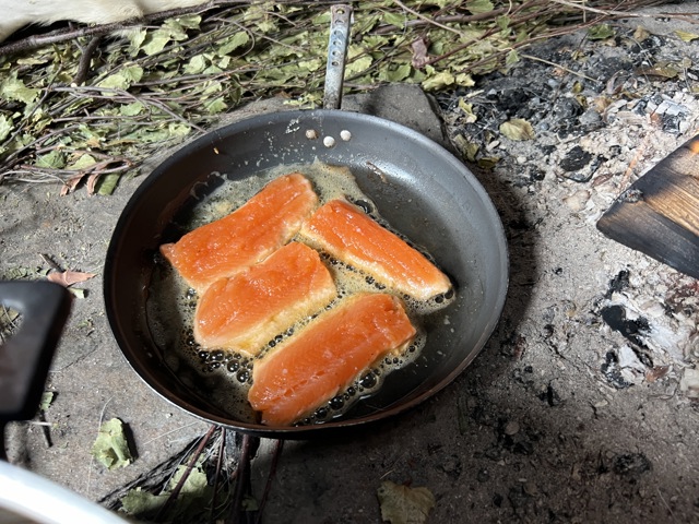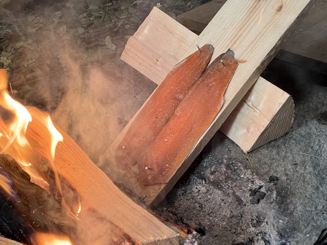 Etter å ha filetert fisken finner han en planke, hammer og spiker, og spikrer ørretfiletene på planken. Så strør han over litt salt, og legger fisken nært bålet, støttet opp av vedkubber.