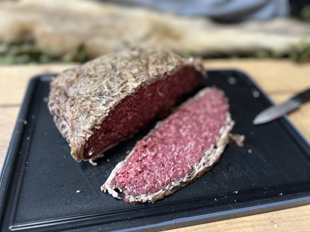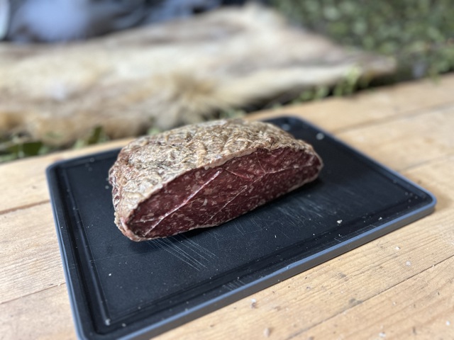 Tilsatt i reinskjøttdeigen er ikke mer enn litt salt. Både røykingen og hengingen etterpå setter smak på kjøttet.