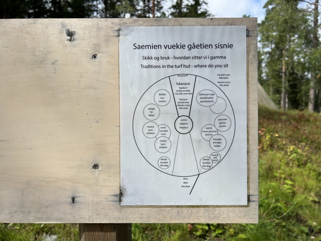 Joma forteller at selv om det ikke er så vanlig lenger å bo i gamma hele sommeren, så brukes den fortsatt i månedene når reinen er på fjellet. Inne i gamma er det et bestemt mønster hvordan folk skal sitte, med de eldre øverst i gamma, og de unge lenger ned. Hunder fikk også plass, nede ved inngangen. I midten er ildstedet og matlagingsplassen.