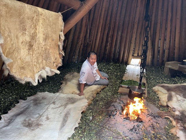 Inne i gamma på Saemien Sijte er det varmt og mykt å sitte på bjørkeris og reinsskinn