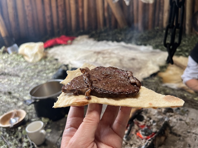 Så spises fileten på nybakt laejpieh, det sørsamiske brødet.