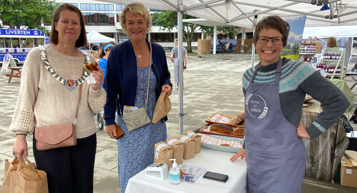 Kanelsnurrene til Jenny på Jørem er kjent som saftige og gode og de blir fort utsolgt når hun er på arrangement. Her er Jenny Domås på Trøndersk Matfestival - Et sted nær deg! i Namsos sammen med varaordfører Kjersti Tommelstad i Namsos og ordfører Bente Estil fra Lierne.