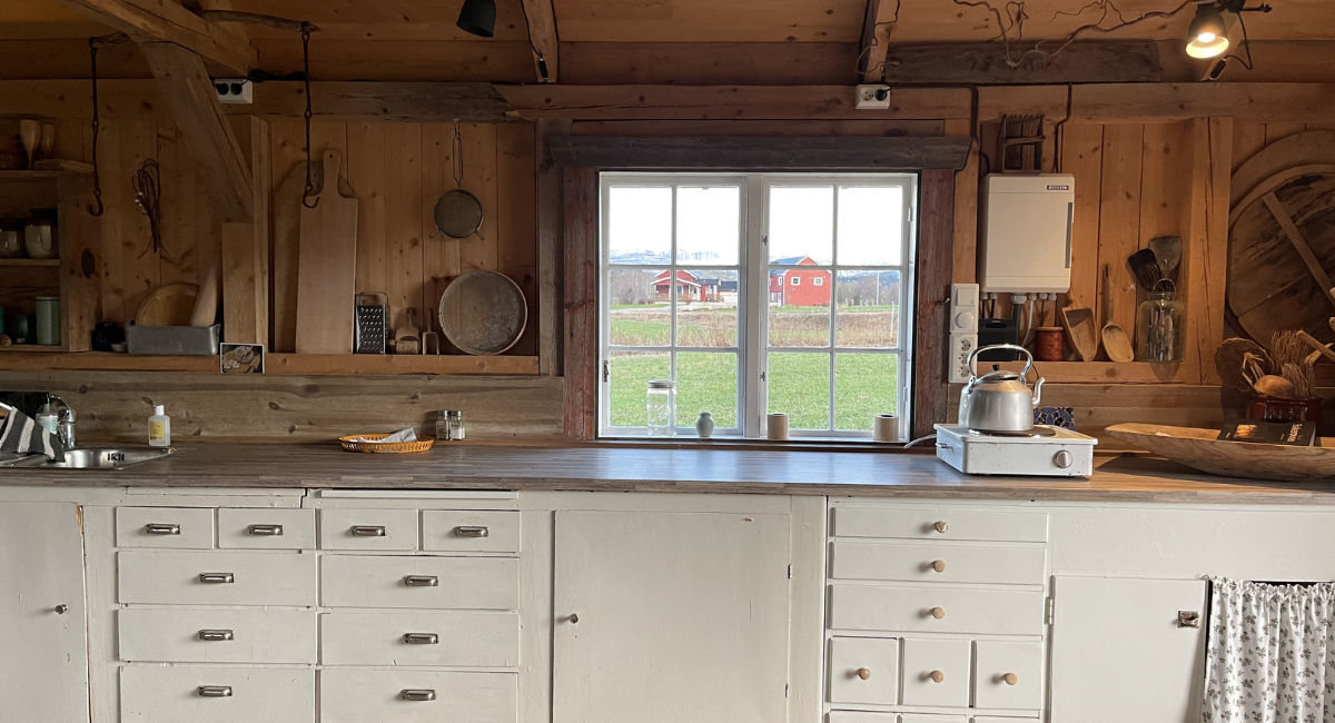 I bakehuset brukes langbord og kjøkkenbenk til bakekurs. Her lages det også steinovnsbakt pizza. Foto: Mai Løvaas