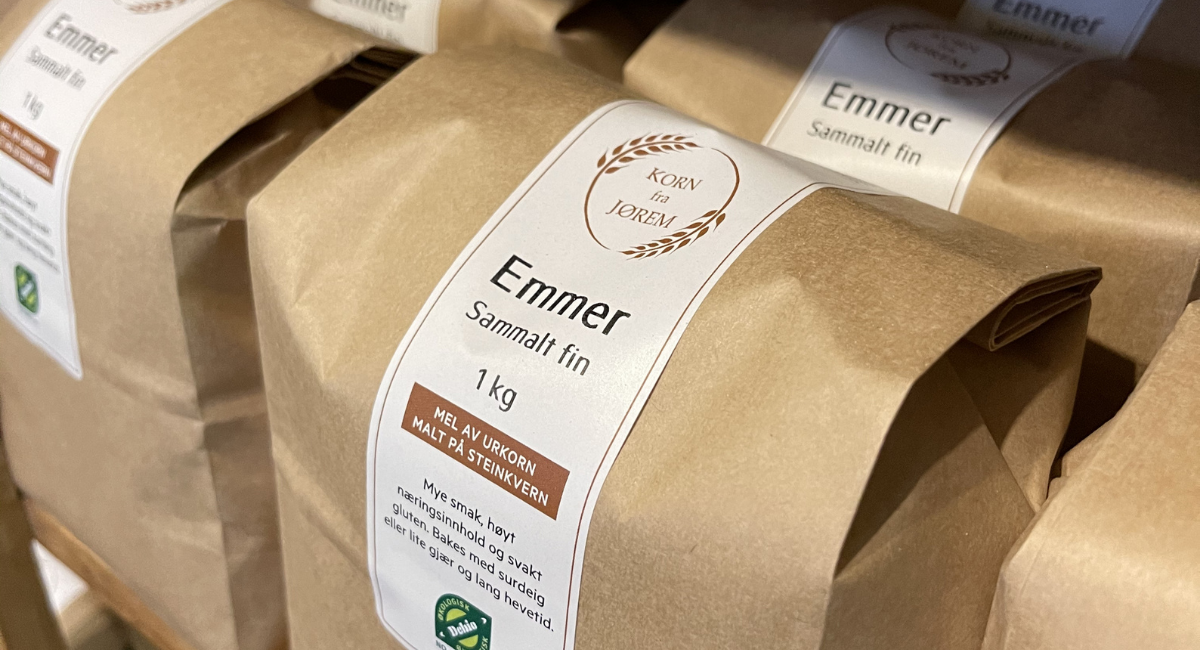 På Jørem gård får du kjøpt mange typer økologisk urkornsmel. Foto: Mai Løvaas