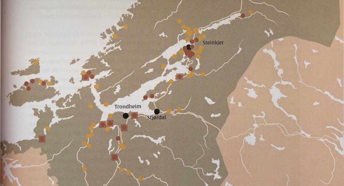 Kartet er fra boka Trønderøl, og viser både gamle gårder, utgravingsplasser og steder der det er funnet bryggesteiner.