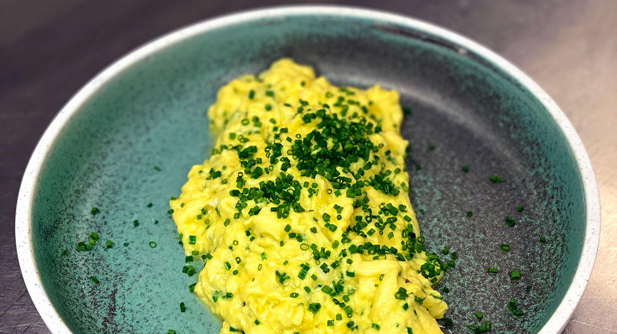 Trikset for å få en fløyelsmyk eggerøre er det samme som for omelett - varmekontroll! Pisk egget godt før du heller det i varm panne. Så drar du panna av varmen, og rører godt så egget ikke blir for varmt. Når eggerøren begynner å bli fast har du i en liten klatt smør og gressløk. Trekk panna tilbake over varmen og rør in smøret. Før røren setter seg helt trekker du panna igjen av varmen, og anretter det hele på tallerken.