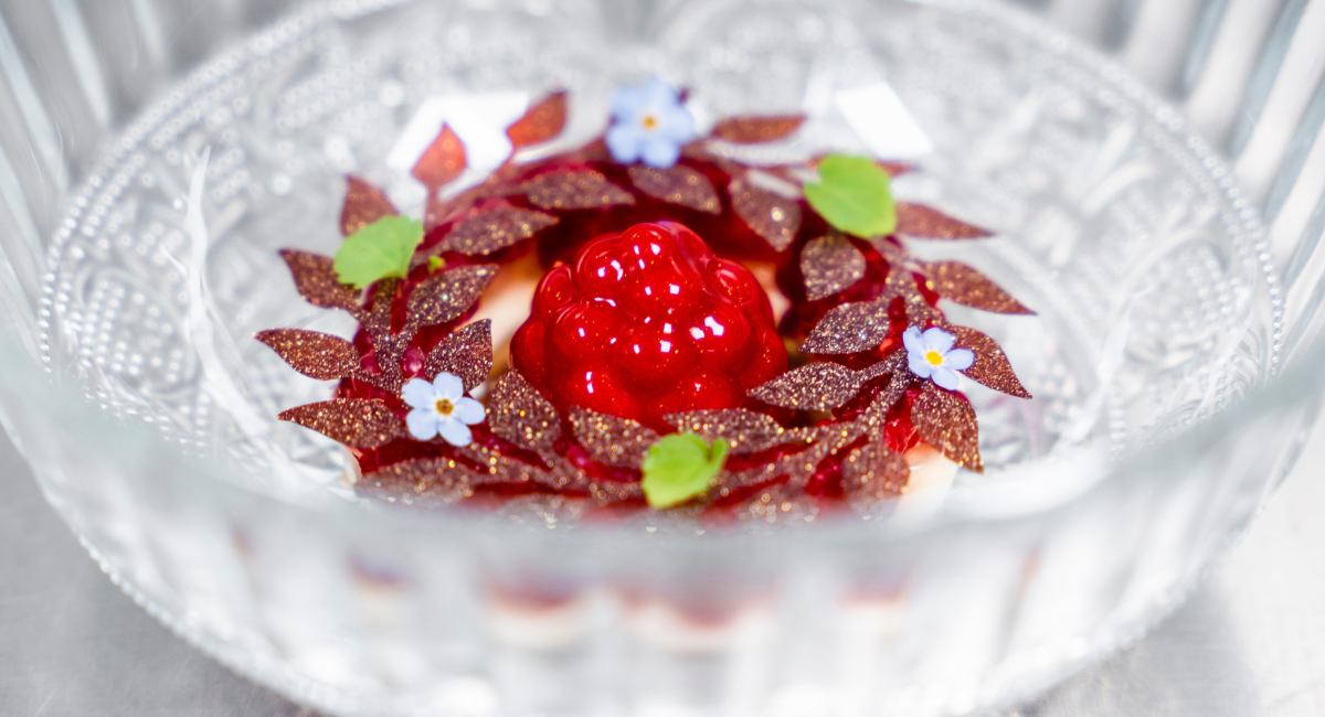To round off the perfect dinner: dessert, by Christopher Davidsen. Diners got a raspberry creation with cream and ice cream, decorated with such beauty that it was hard to dig the fork into.