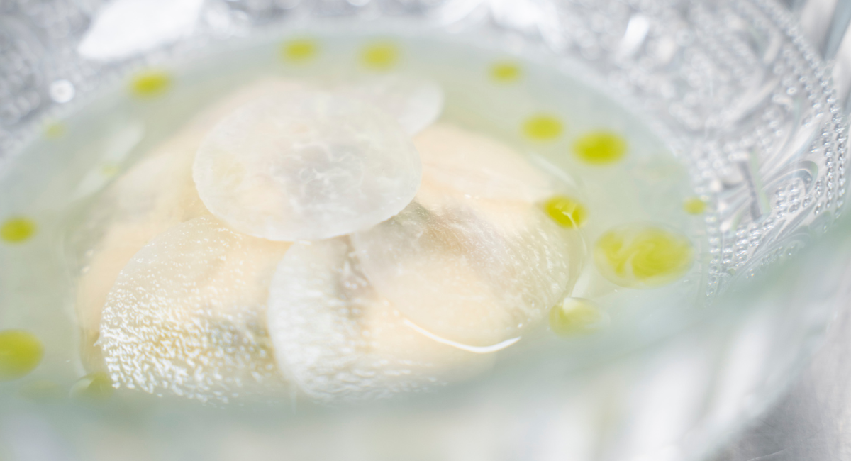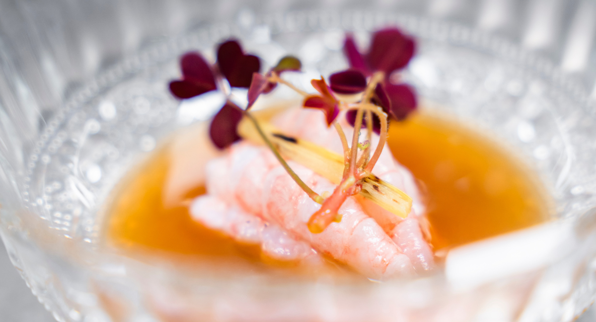 Mikael Svensson from Kontrast in Oslo placed raw shrimp in a glass bowl, surrounded by a rhubarb and shoyu broth. Plush, tart and salty.