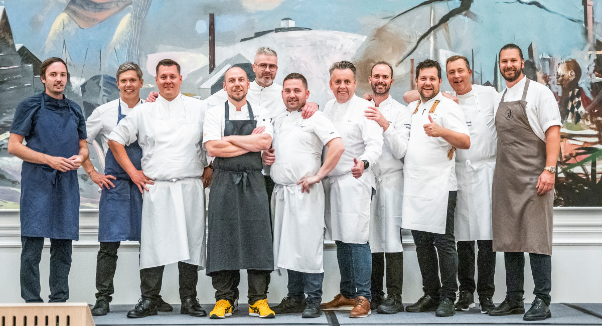 The team of Nordic Taste Dinner; ten chefs, eleven Michelin stars and eleven courses. From left: Jonas Lagerstrøm (Sweden), Tommy Myllymäki (Sweden), Eero Vottonen (Finland), Tommy Tuominen (Finland), Thrainn Freyr Vigfusson (Iceland), Viktor Örn Andrésson (Iceland), Sven Erik Renaa (Norway), Ørjan Johannessen (Norway) and Christopher W. Davidsen (Norway). Photo: Fredrik Ringe.