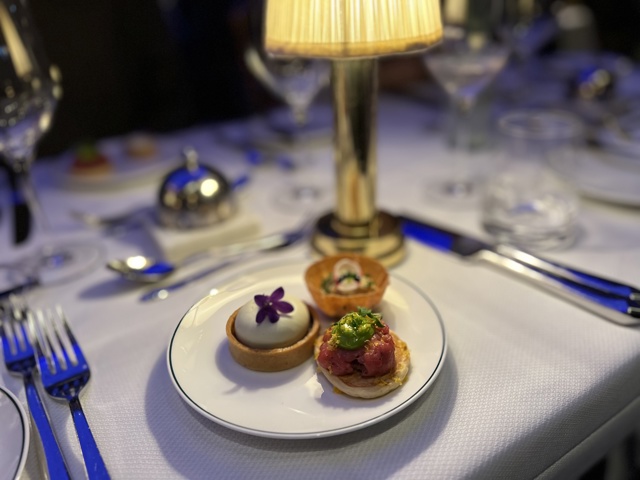 De tre første rettene ble satt på én tallerken og kalt ‘teasere’ og var en smaksreise fra kyst til fjell. Krabbe fra HitraMat, Britannia sin egen blåmuggost Nidelven Blå, laget på Gangstad Gårdsysteri på Inderøya, og tartar av kalv fra Røroskjøtt.