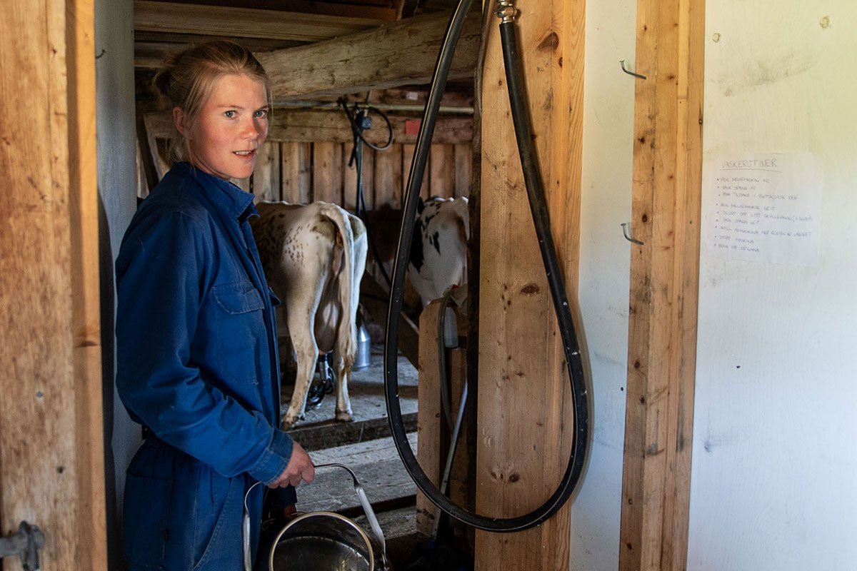 Ragnhild har tatt på seg skaut og arbeidsklær, og gjør slanger og spann klare til å mjølke sine kyr. Hun har nettopp fyrt opp i ovnen som varmer vannet til ysteriet. – En av kyrne våre, Høstøy, har fått et sår på den ene spenen, forteller hun med en bekymret mine, og går ned på huk og studerer det.– Det ser bedre ut i dag. Vi prøver å mjølke den, det er bra for blodsirkulasjonen og for den naturlige helbredelsen, men vi gjør det helt til sist, og tar ikke denne mjølka med inn i produksjonen.Søstrene tar hovedansvar for sine egne dyr her på setra.– Det er enklere sånn. Vi kjenner dyra våre best og det har en del fordeler, som at vi da kan oppdage sykdommer tidlig for å unngå at noe kommer i mjølka, forklarer Ragnhild og vasker juret til Svarta. Søstrenes blikk møtes ofte. Det er tydelig at de kjenner hverandres rutiner og gange i arbeidet.