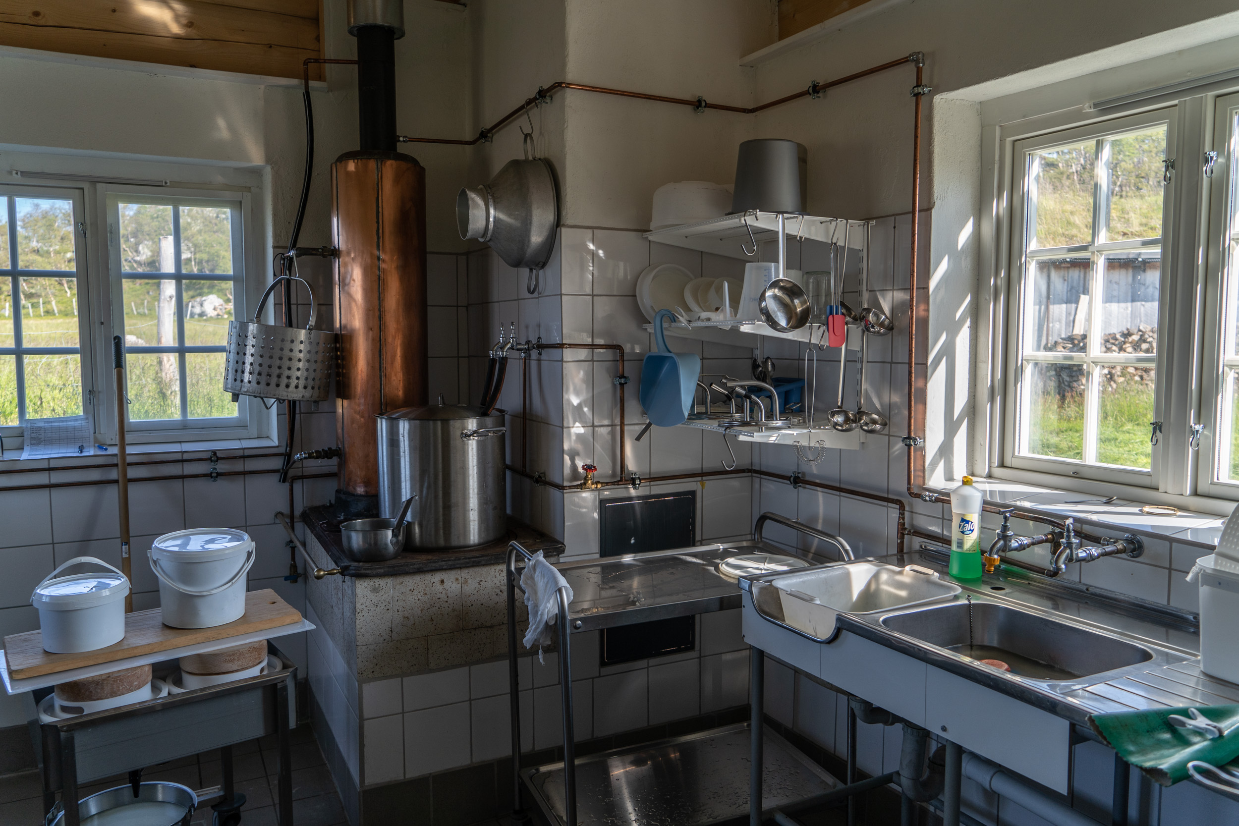 Med rent arbeidstøy bærer Turid bøttene med geitemelk inn i ysteriet. Hun heller melka over i et eget ystekar, og studerer merkene for å se hvor mange liter dyra har produsert i dag.Ysteriet nyter godt av varmen fra den vedfyrte ovnen med varmemagasin. Turid sjekker temperaturen på vannet som står og ryker oppe på ovnen.