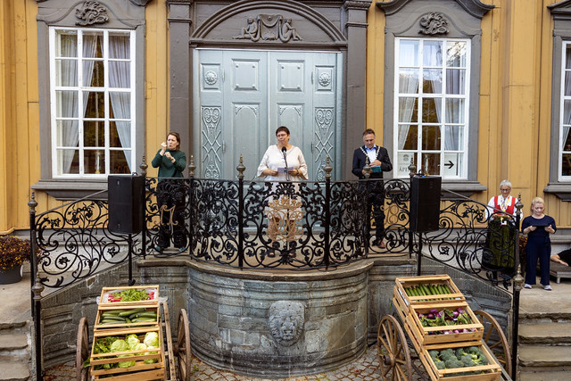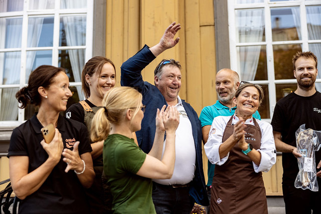 På Stiftsgårdstrappen fikk Landbruks og Matministeren alle vinnere av prisene i regi Trøndersk Matfestival 2023 opp på trappa for å motta den store publikumshyllesten.