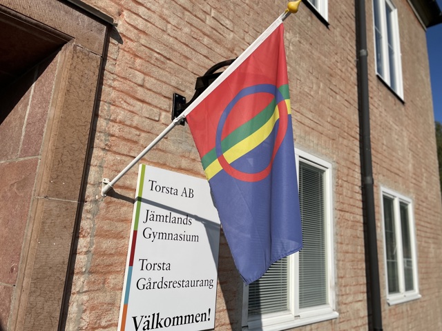 Torsta Naturbruksgymnasium, med samisk flagg på døra, er partnerskole i Syster-prosjektet.