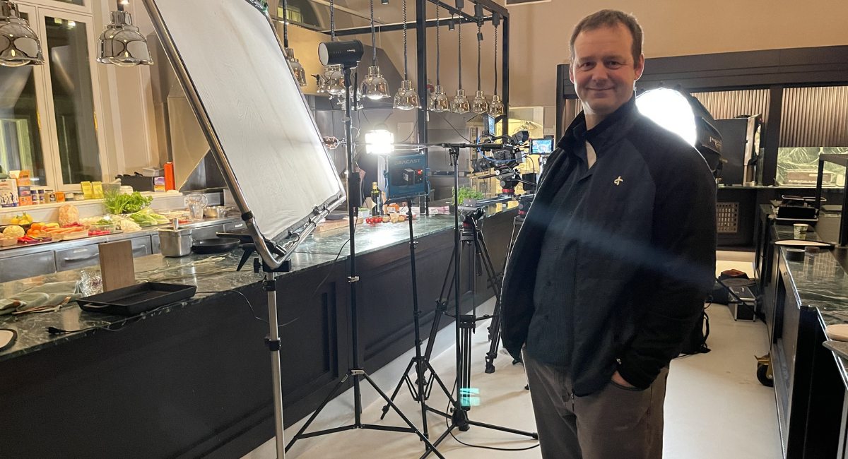 Lars Erik Vesterdal lager kokkefilmer med trønderske kjøttprodukter. Foto: Mai Løvaas