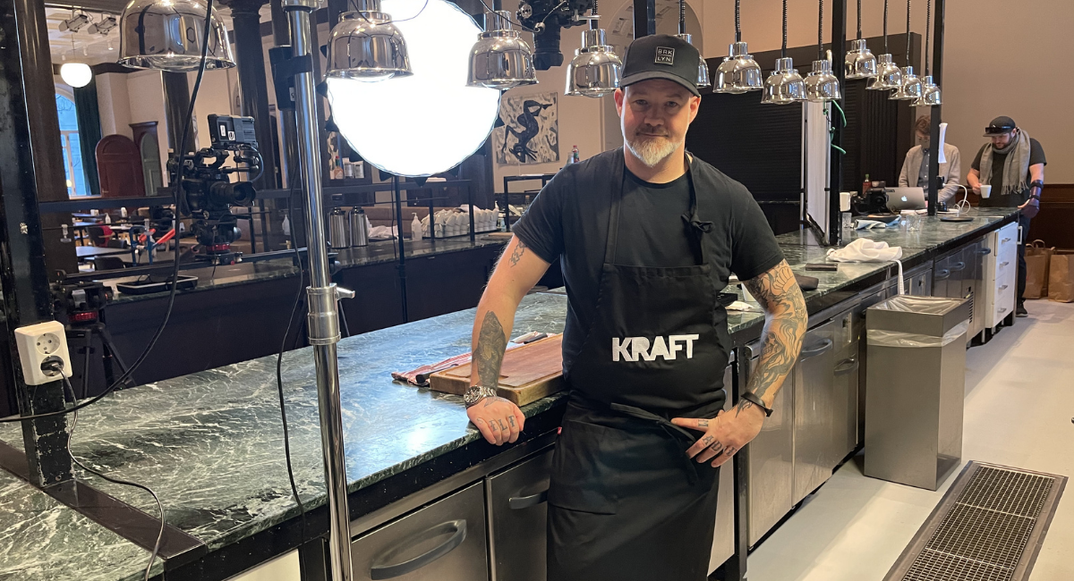 Henning Nørholm fra Inderøy Slakteri er i Banksalen i Trondheim med produkter som skal filmes til Horeca-bransjen. Foto: Mai Løvaas