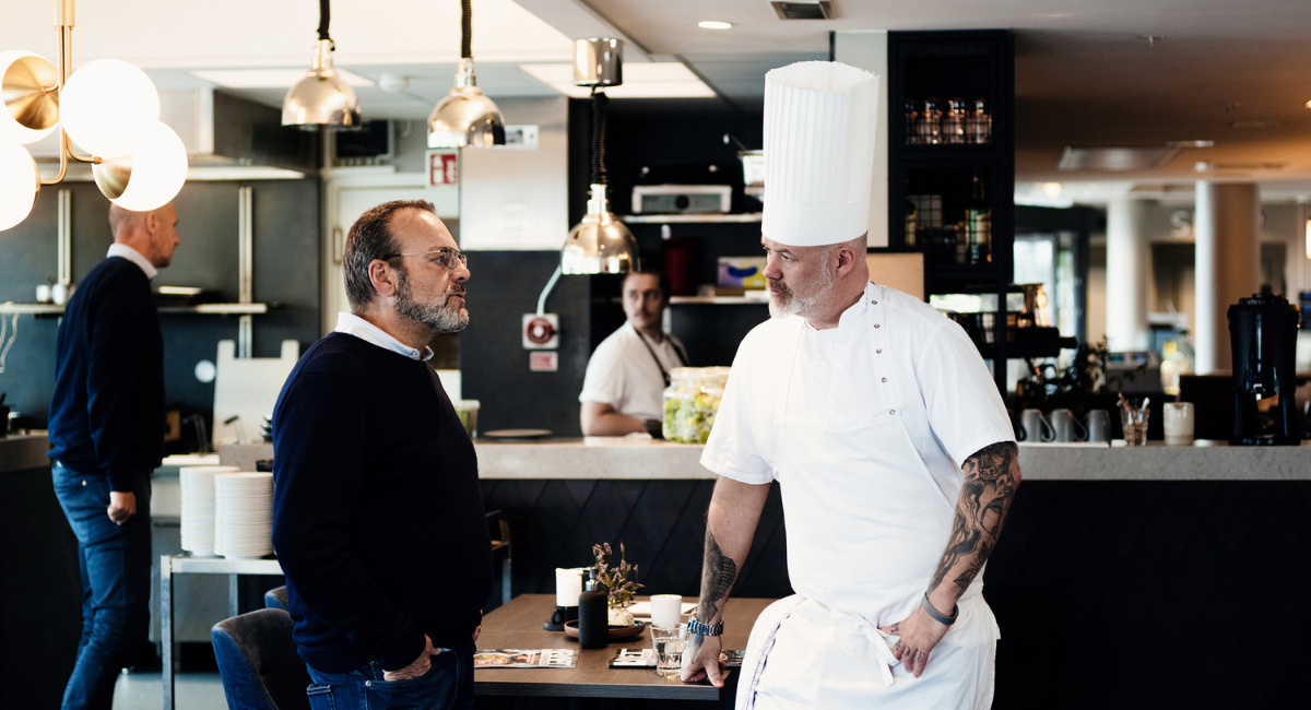 Tore Meland fra Betania Malvik og ny restaurantør på Ila Brannstasjon tar en prat med kokk Lars Erik Vesterdal. Foto: Ole Ekker