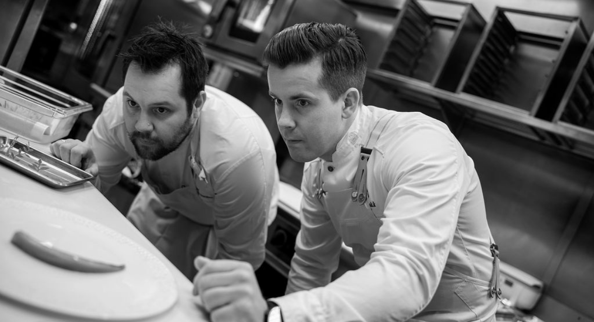 Christopher Davidsen og Håkon Solbakk ved Speilsalen. Solbakk ble nettopp trukket ut til å være en av fem finalister som skal kjempe om å delta på Bocuse d´Or, også kjent som verdensmesterskapet i kokkekunst.