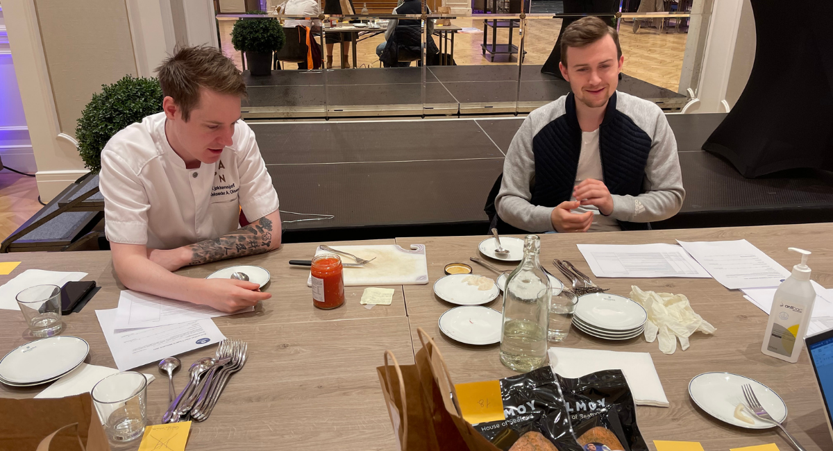Assisterende kjøkkensjef på Britannia Hotel Mikael Leiknes noterer grundig mens Håvard Klempe fra Søstrene Karlsen finner fram det neste de skal smake på.