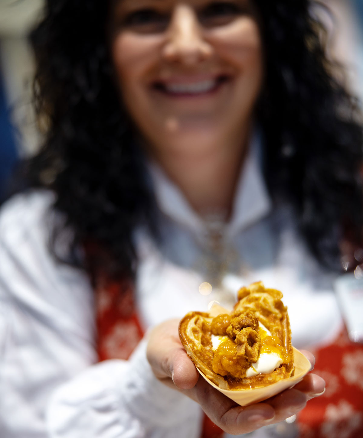 Vafler faller alltid i smak, men det er ingen underdrivelse å si at vaffelmelet fra Gullimunn tar opplevelsen til nye høyder! Og for å være på den sikre siden kjører vi dobbelt: Vaffelkrisp på nystekt vaffel.