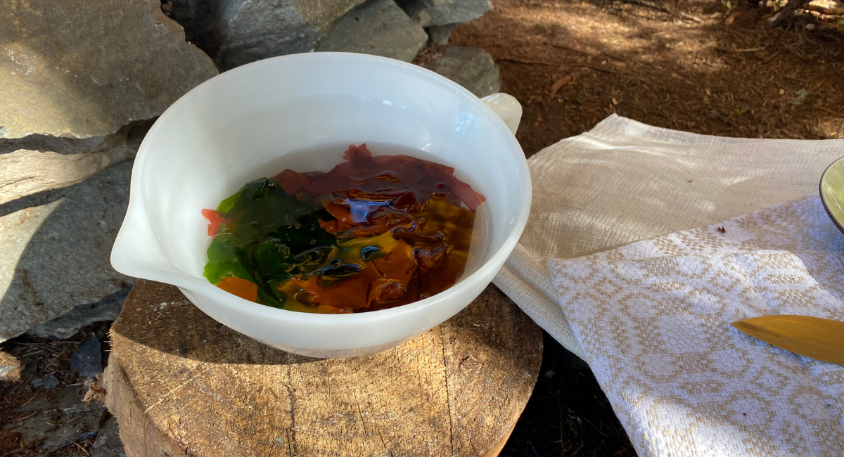 Akkurat nå er det sesong for innhøsting av tang og tare. Visste du at det finnes en sort tang som smaker som bacon? Her ved bålplassen har Ane og Geir Arne kursene sine i både matlaging og sanking. Like ved ligger glampingteltet.