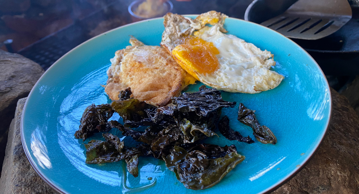 Stekt egg med "baconalge". Eggene er hentet noen meter unna bålplassen og "baconet" er en liten rødalge som kalles søl (Palmaria palmata), den er Full av protein og smak.