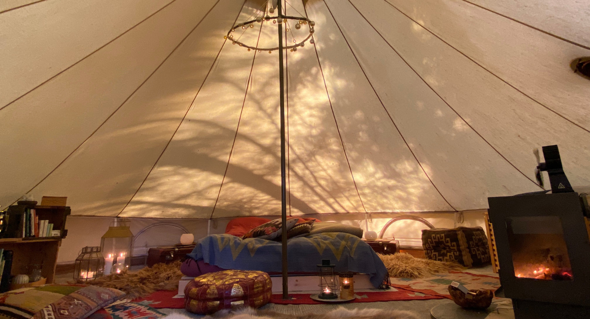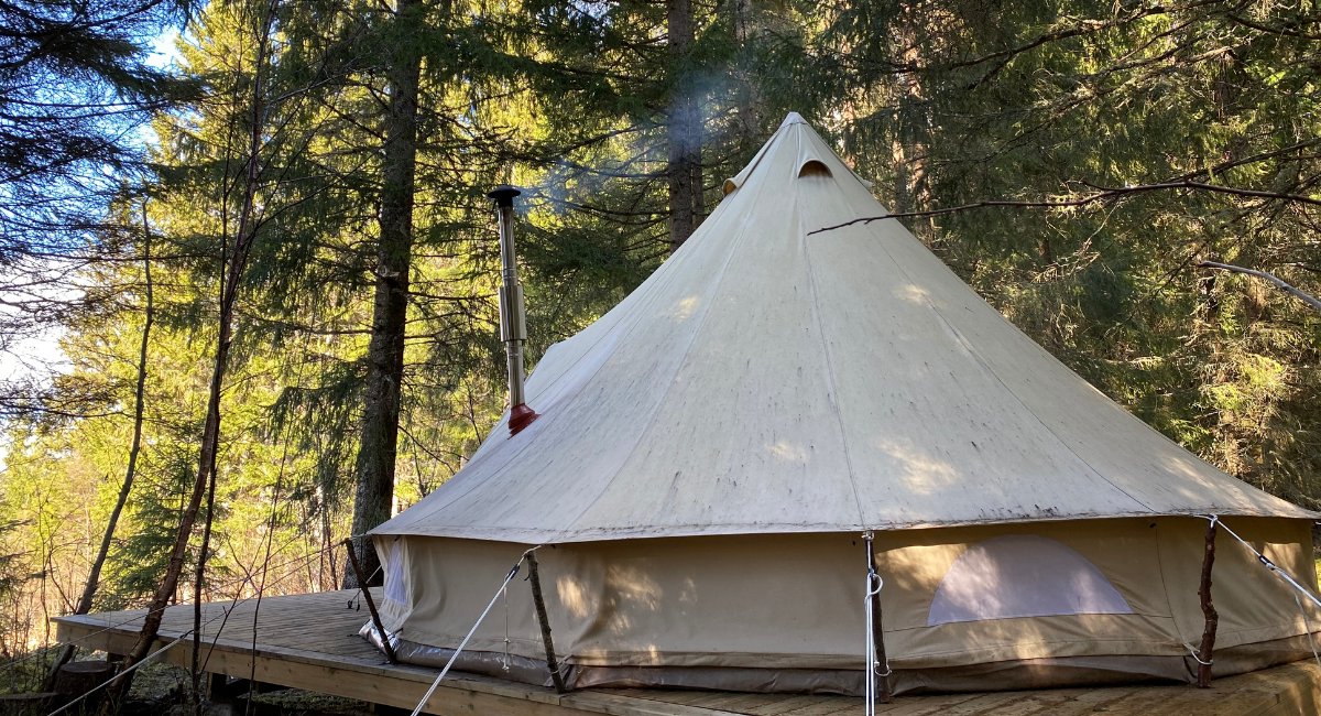 Glampingteltet er delikat innredet med skinn, puter, tepper, stearinlys og en god seng. Vedovnen varmer godt og vertskapet har tenkt på de fleste detaljer. På utetoalettet er det varmt vann i kanner som du kan vaske deg i etter et besøk. Du kan høre hakkespett og et rikt fugleliv, studere ekornet som er "nabo" eller gå en tur i området.